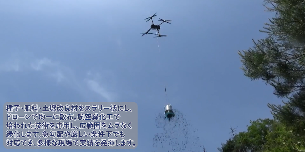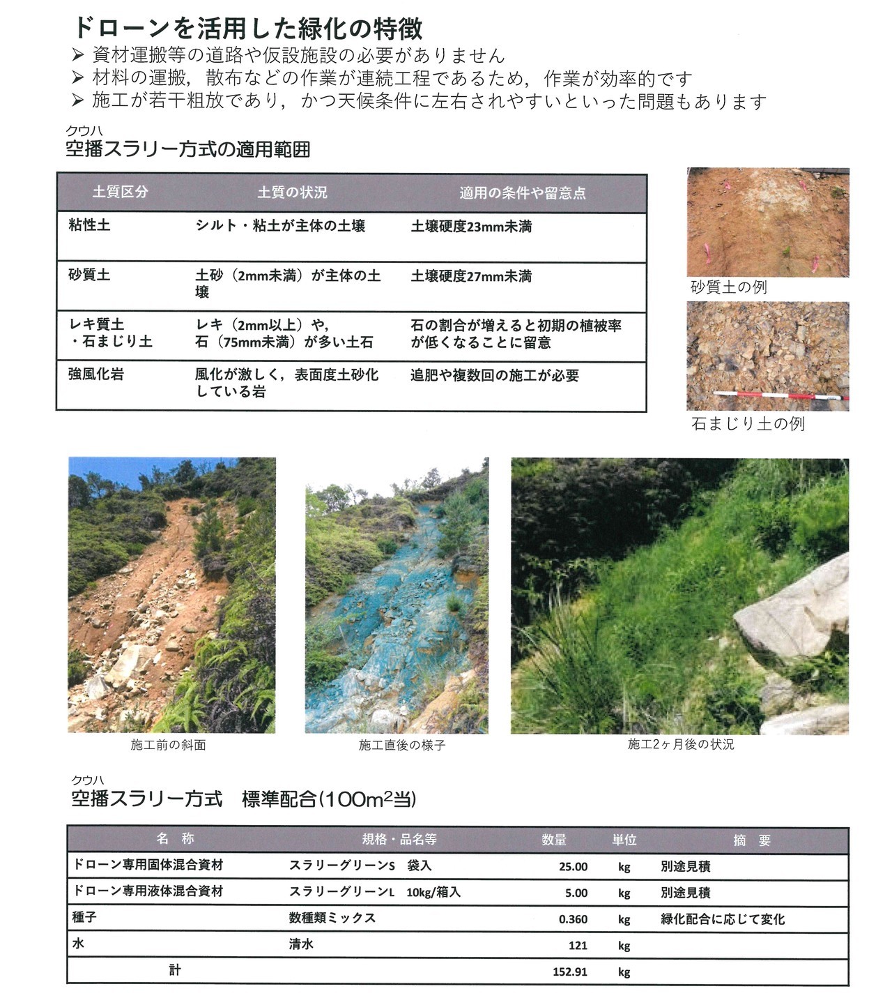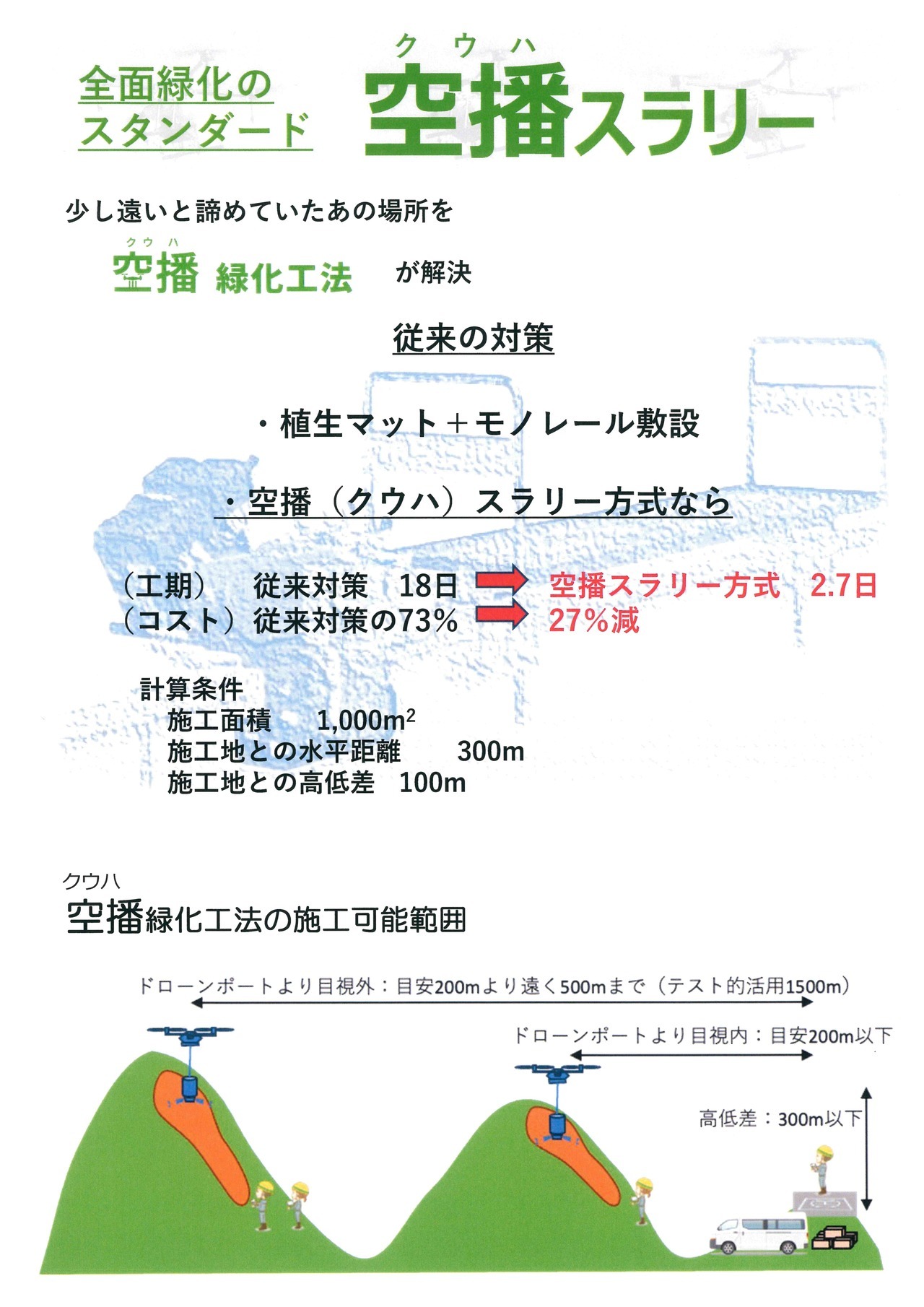 【空播(くうは)スラリー方式】は従来の施工を大きく上回る効率性、施工コストのダウンという2つの優位性を兼ね備えています。
